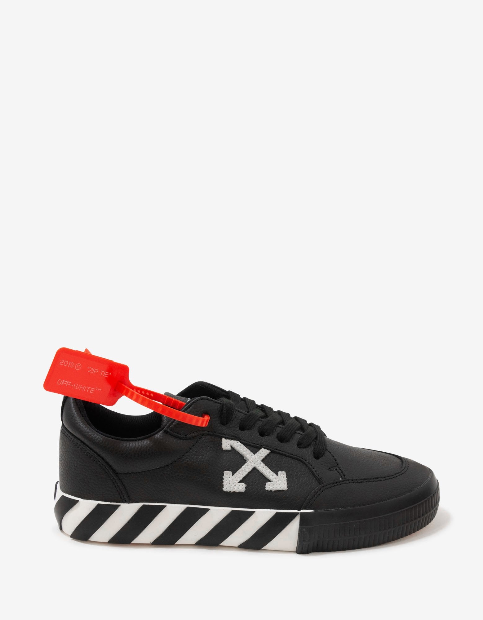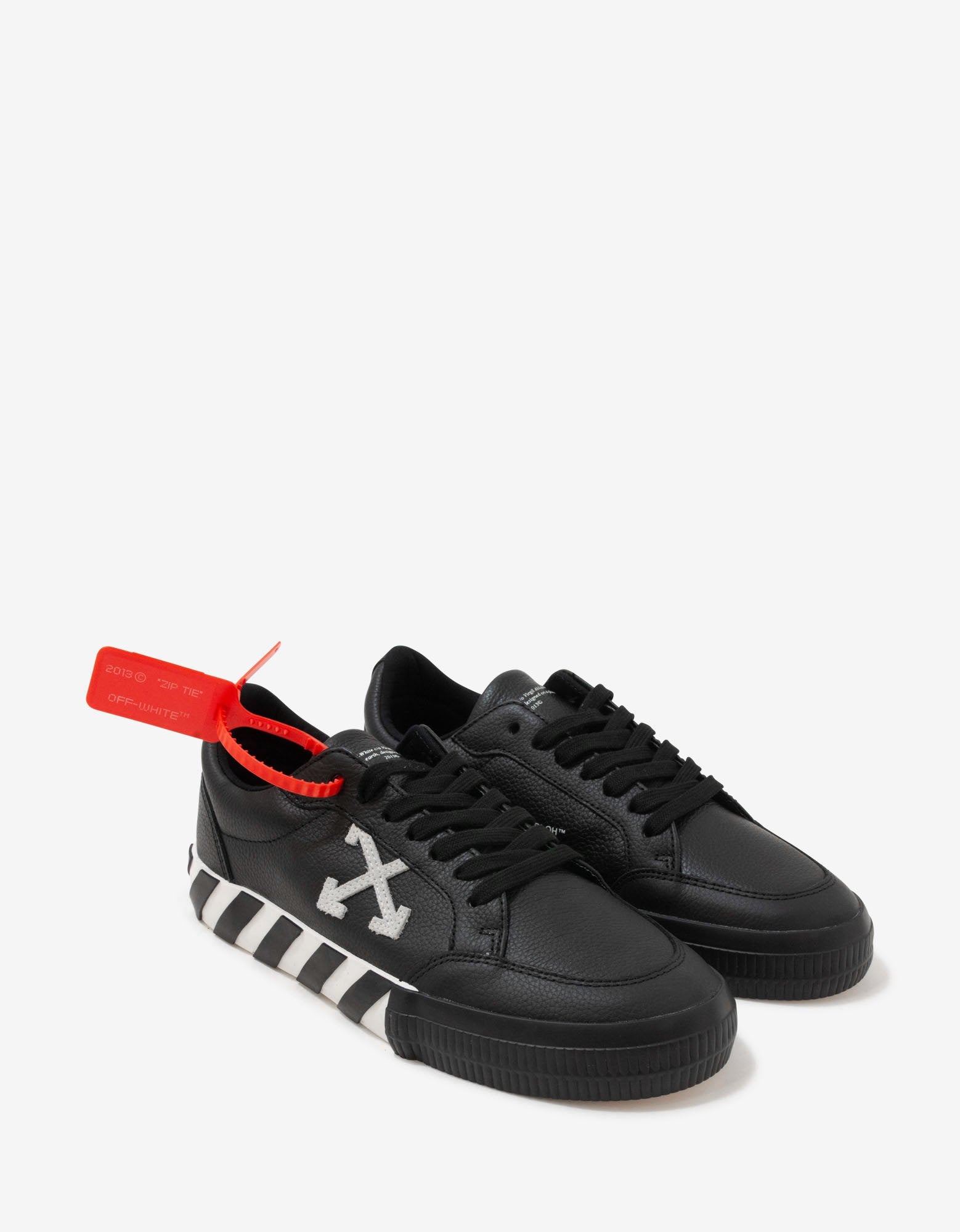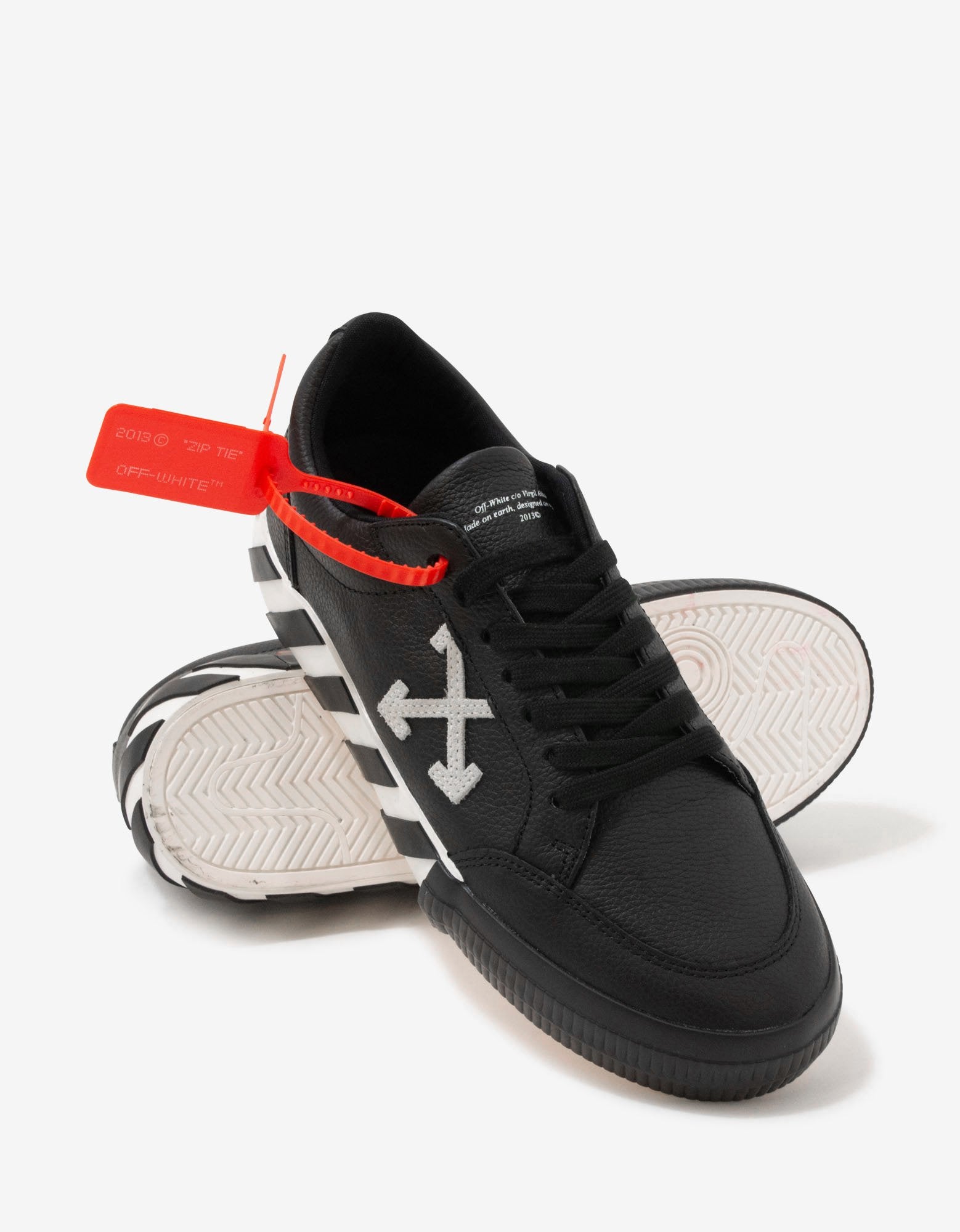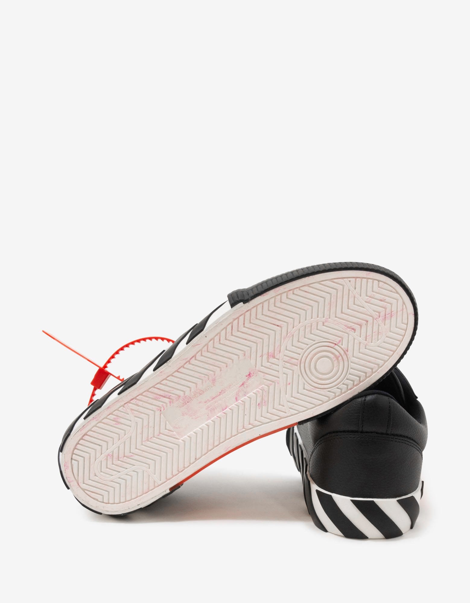 - Off-white rubber sole with black and white striping at the midsole