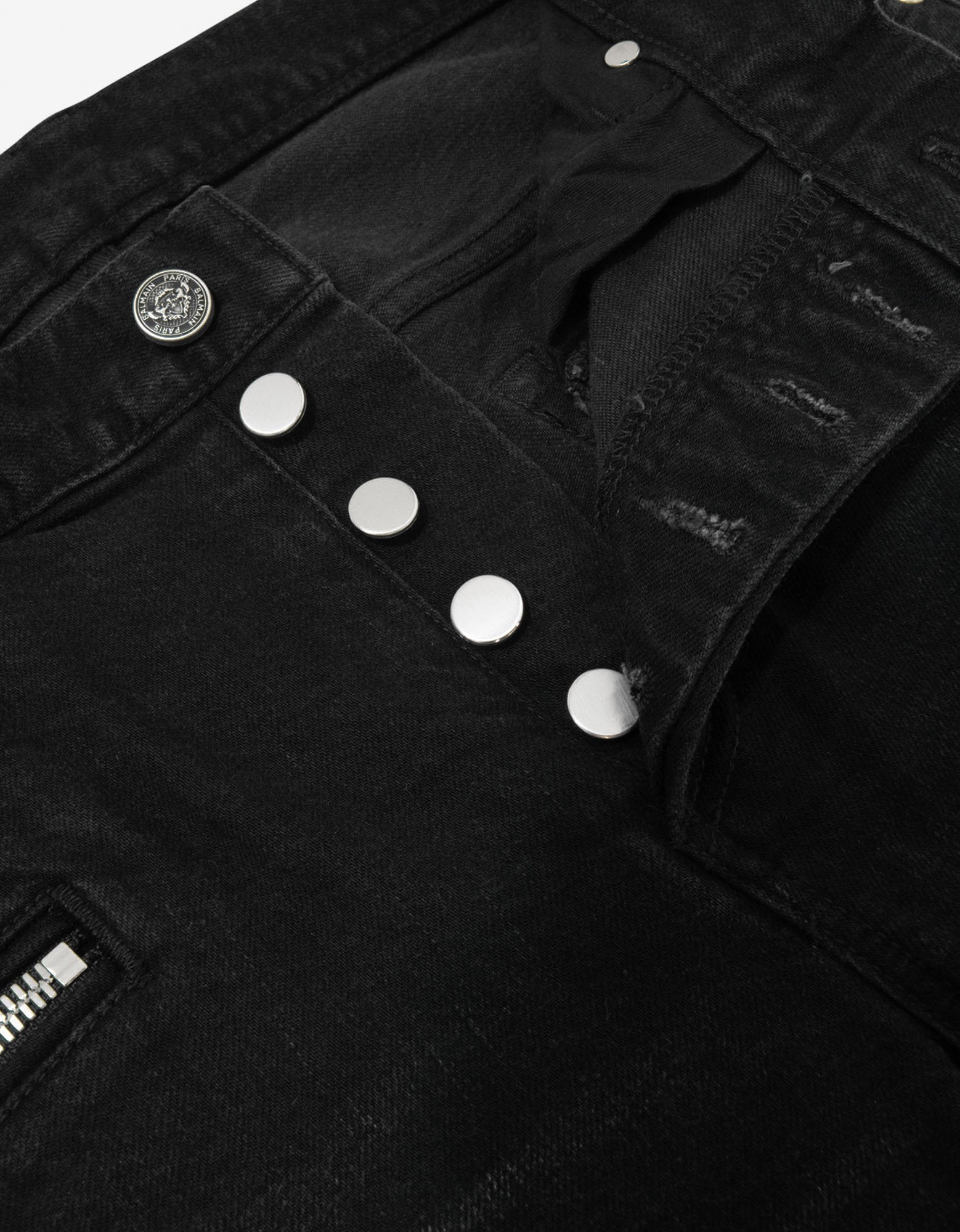 - Concealed 4-button fly with a logo-engraved waist button