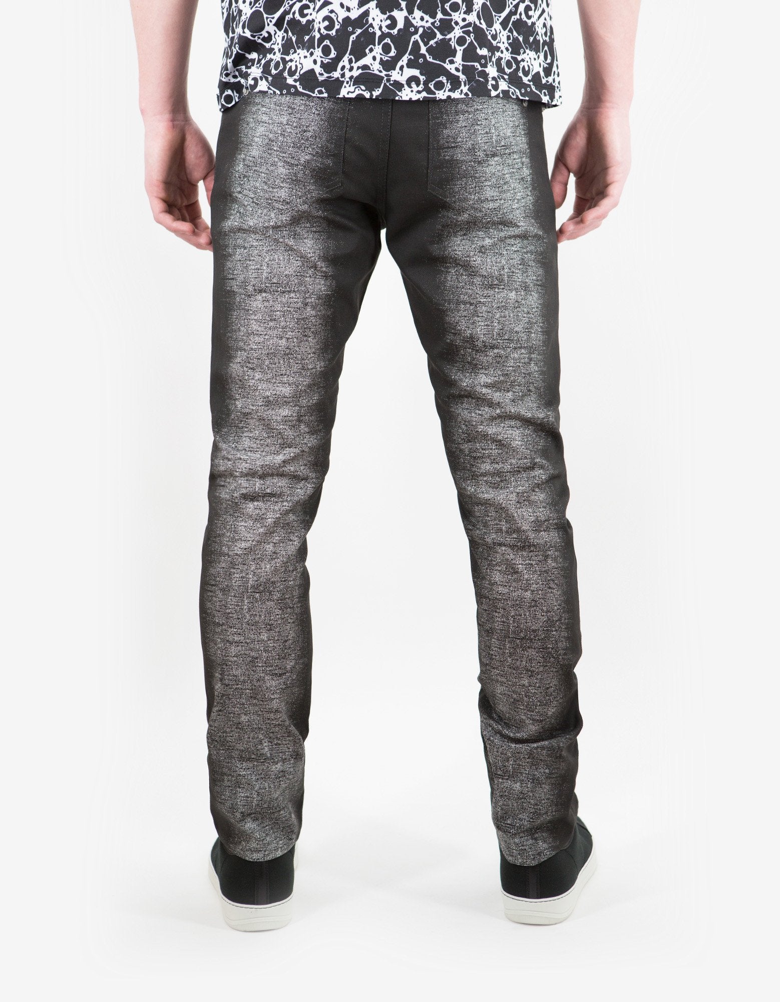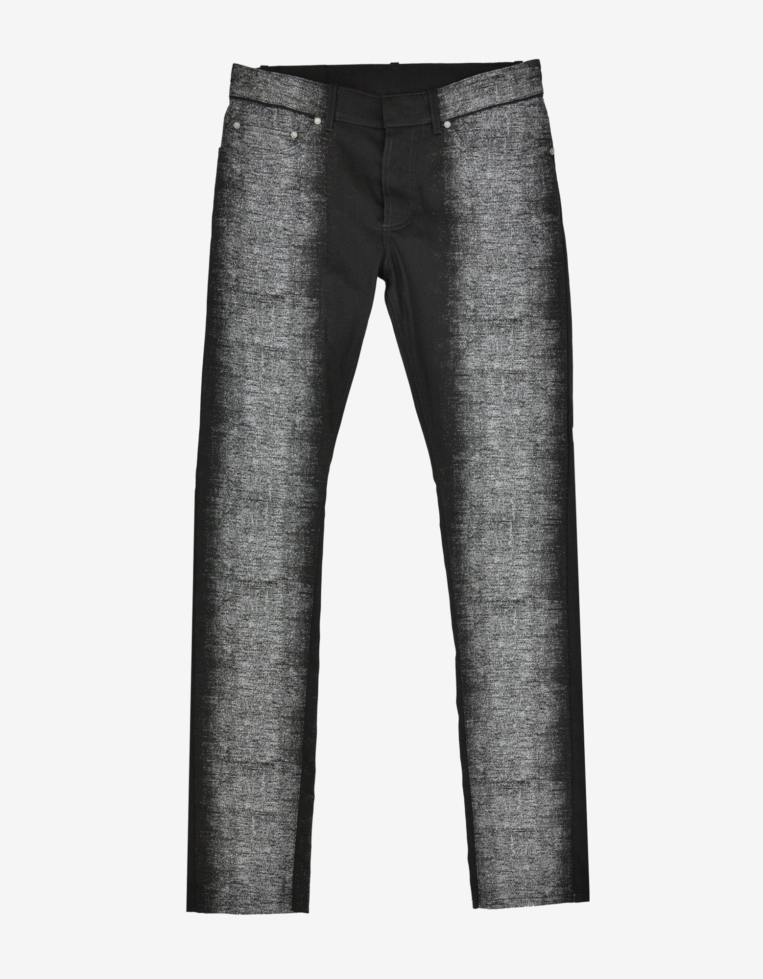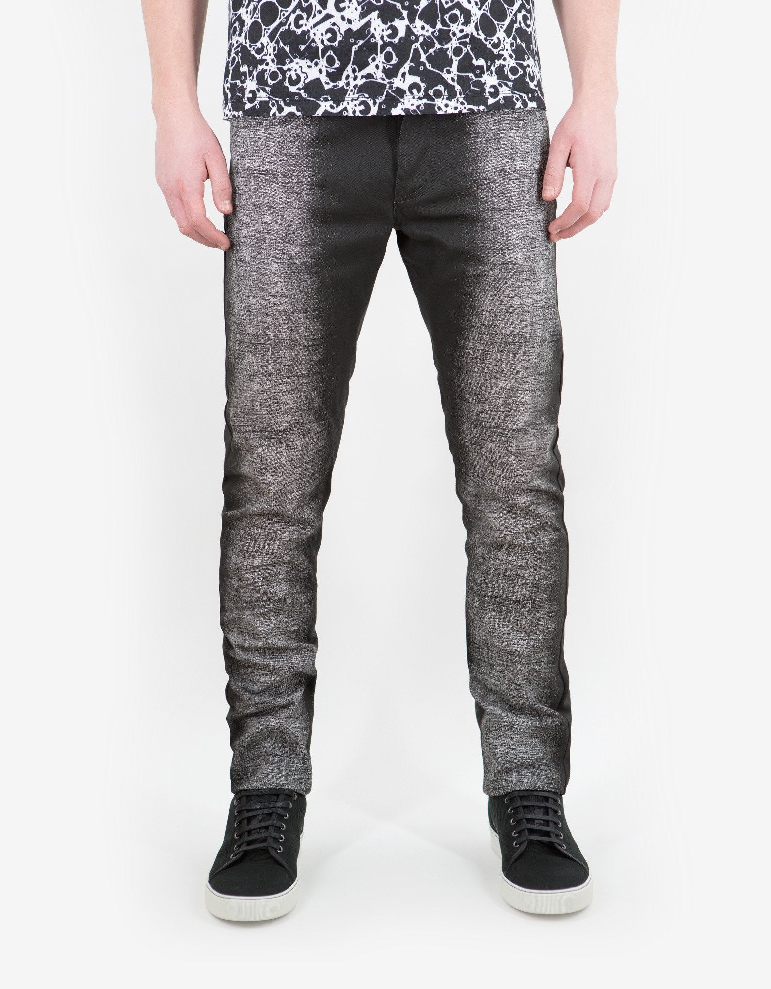These black light cotton jeans from Balenciaga are slim fitting and feature white spray paint effect detail on the front and rear. Crafted in a classic five pocket style, these jeans are complete with a concealed four button fly and a Balenciaga badge on the waist rear.