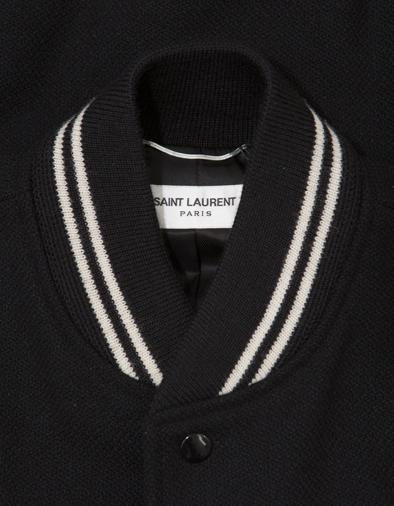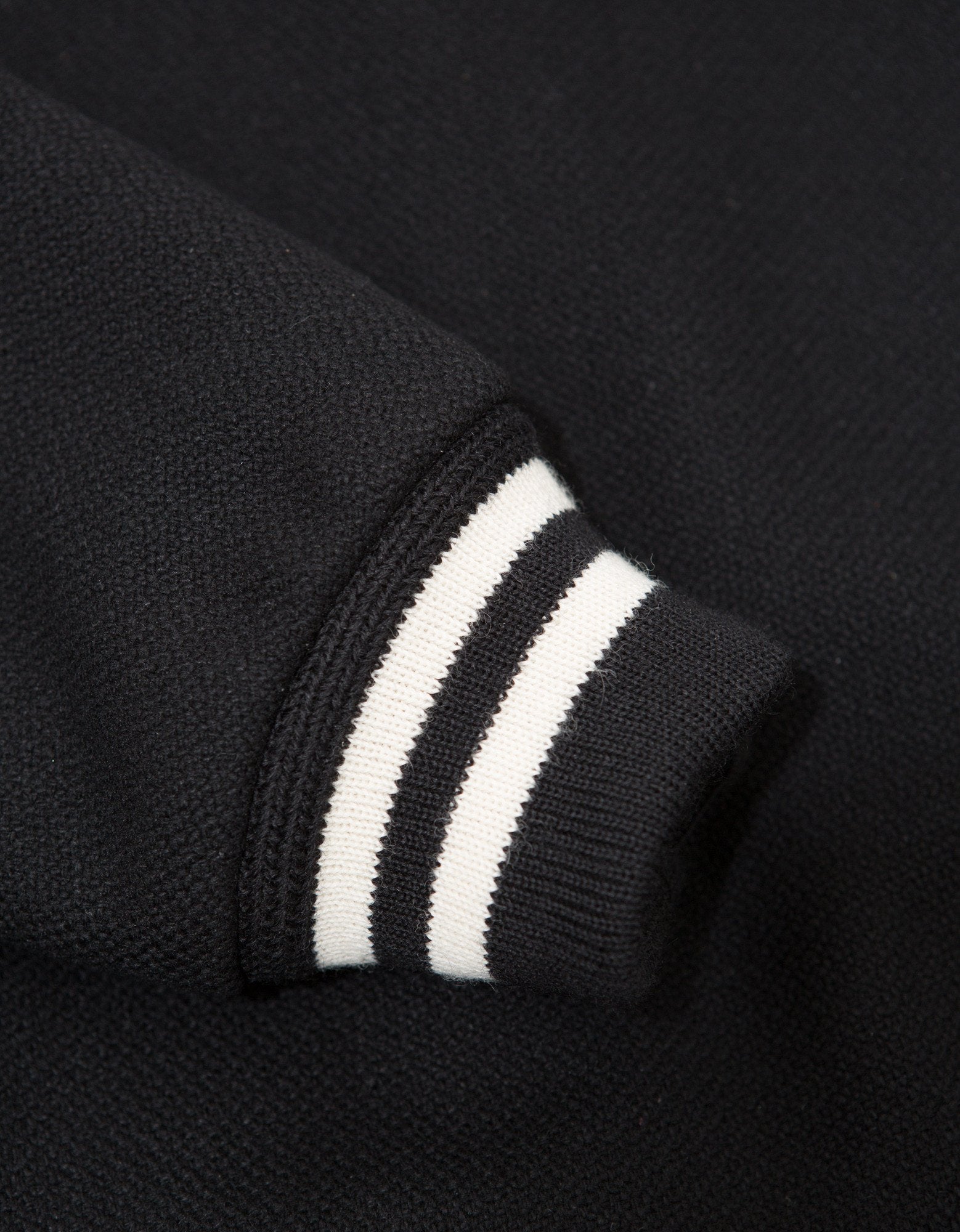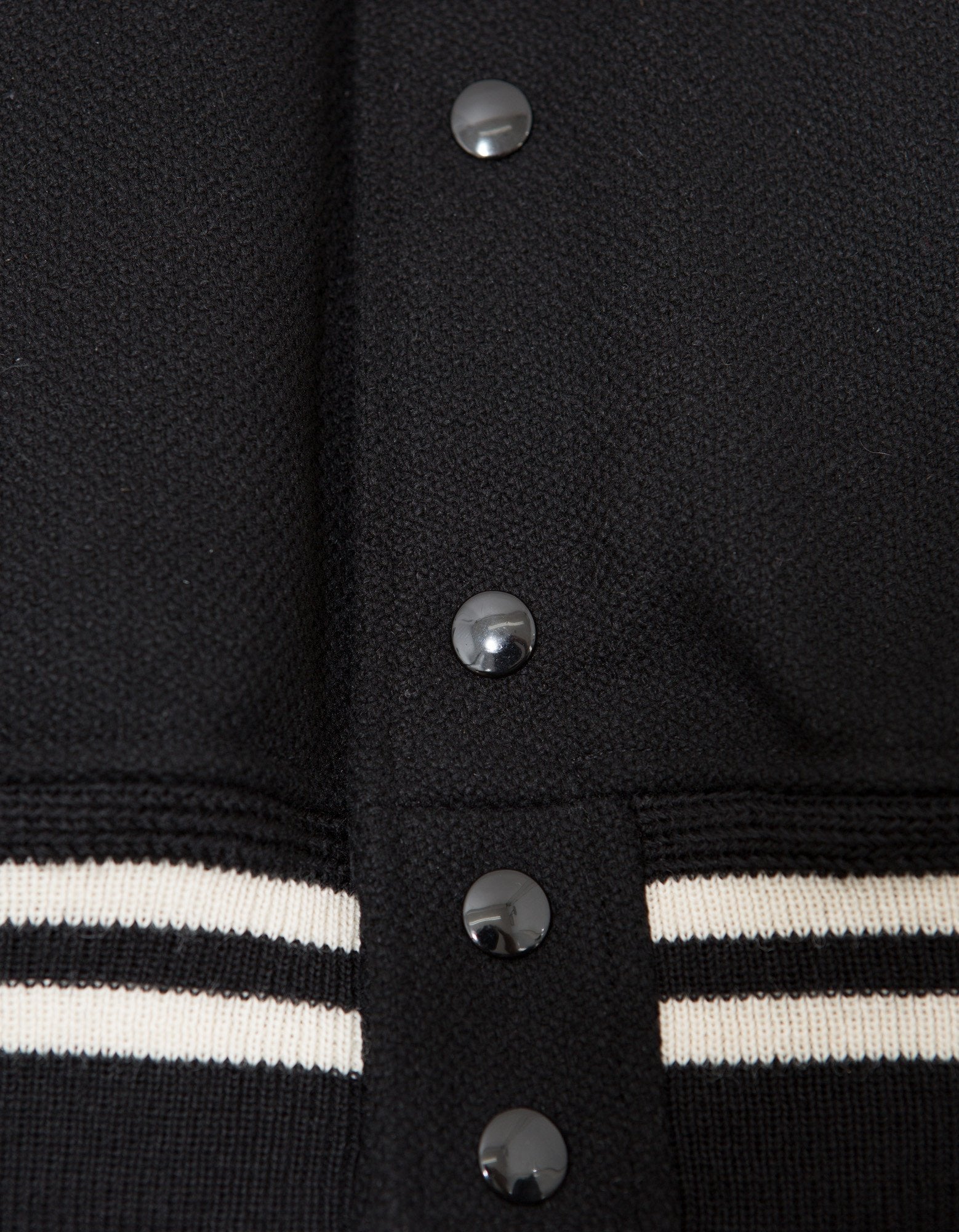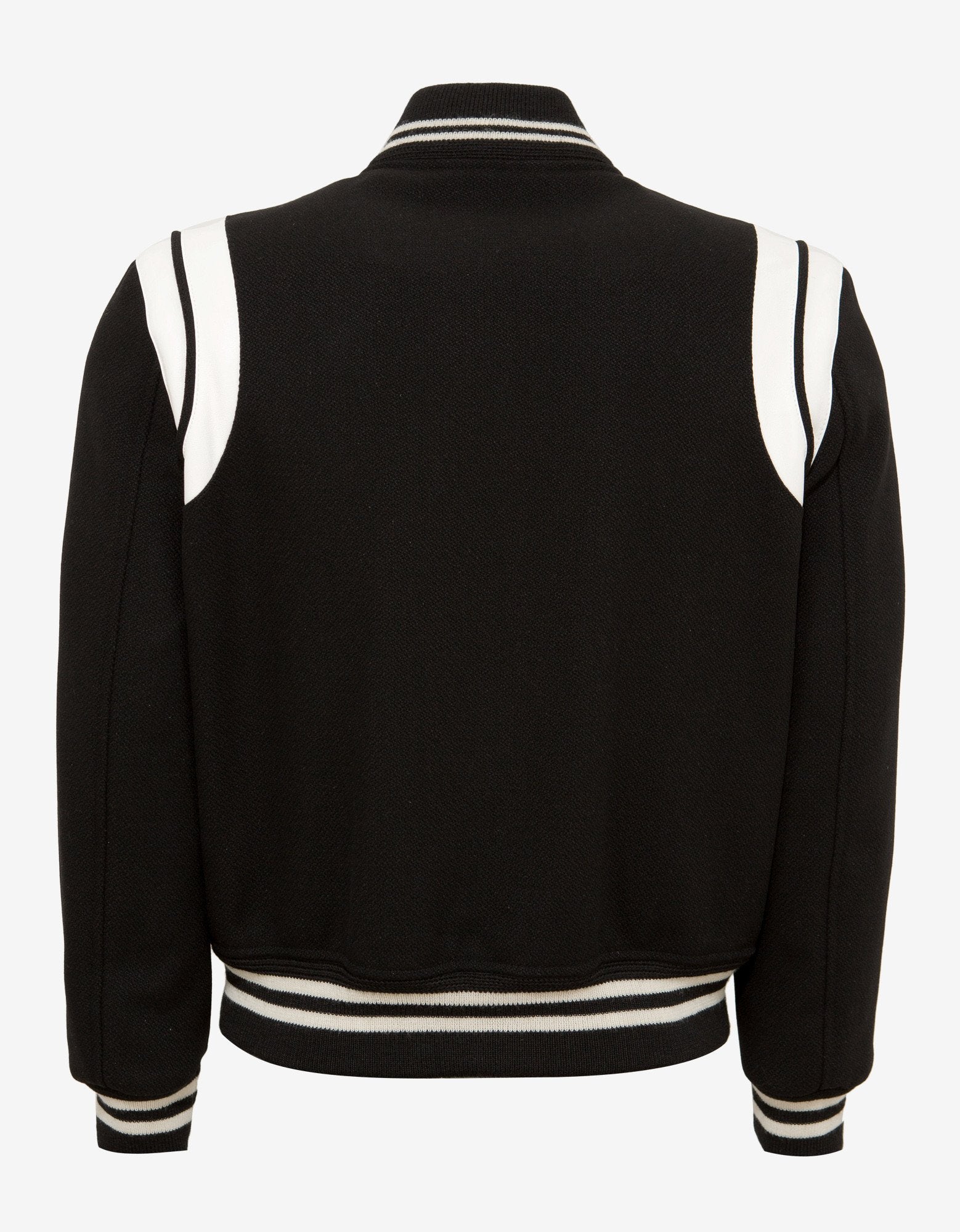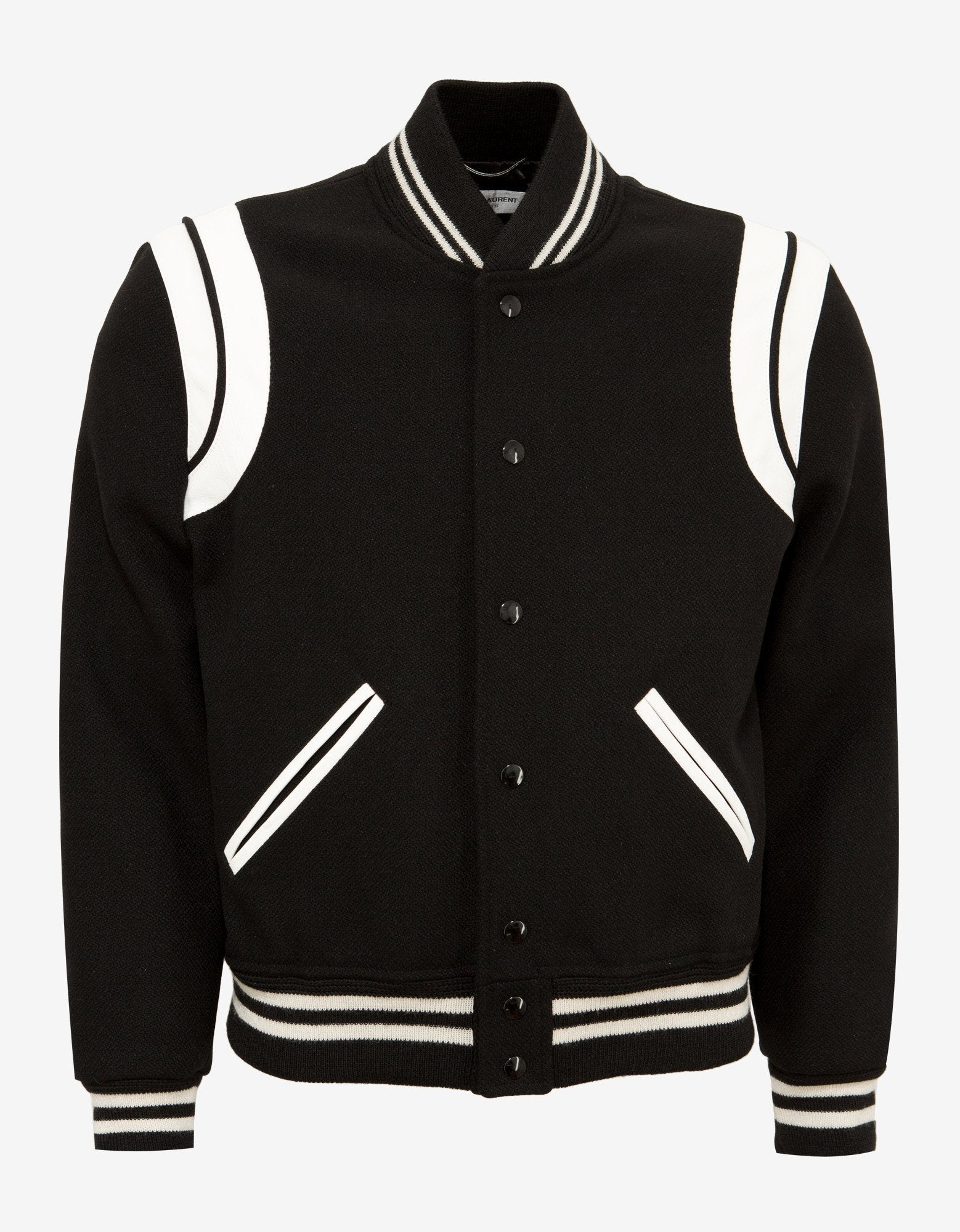 • Contrasting white leather trim detail at the shoulders and front slash pockets
